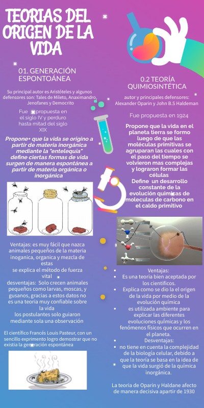 Ventajas: es muy fácil que nazca animales pequeños de la materia inoganica, organica y mezcla de estas se explica el método de fuerza vital desventajas: Solo crecen animales pequeños como larvas, moscas, y gusanos, gracias a estos datos no es una teoria muy confiable sobre la vida los postulantes solo guiaron mediante sola una observación