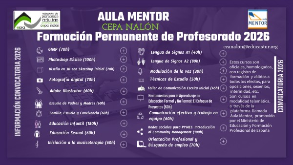 Estos cursos son oficiales, homologados, con registro de formación y válidos a todos los efectos, para oposiciones, sexenios, interinidad, etc. Son cursos en modalidad telemática, a través de la plataforma llamada Aula Mentor, promovido por el Ministerio de Educación y Formación Profesional de España