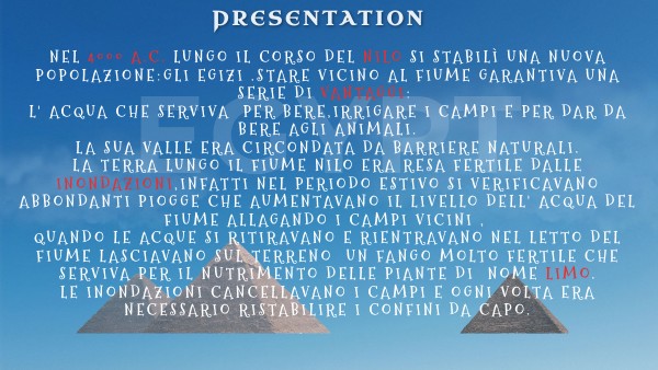 NEL 4000 A.C. LUNGO IL CORSO DEL NILO SI STABILì UNA NUOVA POPOLAZIONE:GLI EGIZI .STARE VICINO AL FIUME GARANTIVA UNA SERIE DI VANTAGGI: L' ACQUA CHE SERVIVA PER BERE,IRRIGARE I CAMPI E PER DAR DA BERE AGLI ANIMALI. LA SUA VALLE ERA CIRCONDATA DA BARRIERE NATURALI. LA TERRA LUNGO IL FIUME NILO ERA RESA FERTILE DALLE INONDAZIONI,INFATTI NEL PERIODO ESTIVO SI VERIFICAVANO ABBONDANTI PIOGGE CHE AUMENTAVANO IL LIVELLO DELL' ACQUA DEL FIUME ALLAGANDO I CAMPI VICINI , QUANDO LE ACQUE SI RITIRAVANO E RIENTRAVANO NEL LETTO DEL FIUME LASCIAVANO SUL TERRENO UN FANGO MOLTO FERTILE CHE SERVIVA PER IL NUTRIMENTO DELLE PIANTE DI NOME LIMO. LE INONDAZIONI CANCELLAVANO I CAMPI E OGNI VOLTA ERA NECESSARIO RISTABILIRE I CONFINI DA CAPO.