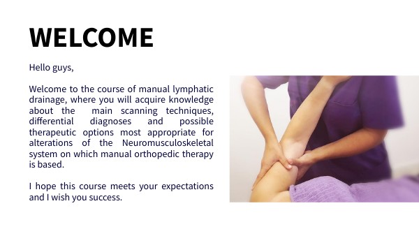 Hello guys, Welcome to the course of manual lymphatic drainage, where you will acquire knowledge about the main scanning techniques, differential diagnoses and possible therapeutic options most appropriate for alterations of the Neuromusculoskeletal system on which manual orthopedic therapy is based. I hope this course meets your expectations and I wish you success.