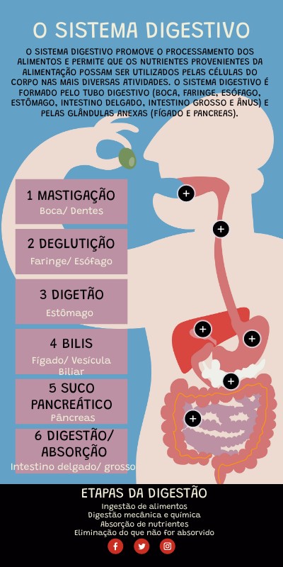 O sistema digestivo promove o processamento dos alimentos e permite que os nutrientes provenientes da alimentação possam ser utilizados pelas células do corpo nas mais diversas atividades. O sistema digestivo é formado pelo tubo digestivo (boca, faringe, esófago, estômago, intestino delgado, intestino grosso e ânus) e pelas glândulas anexas (fígado e pAncreas).