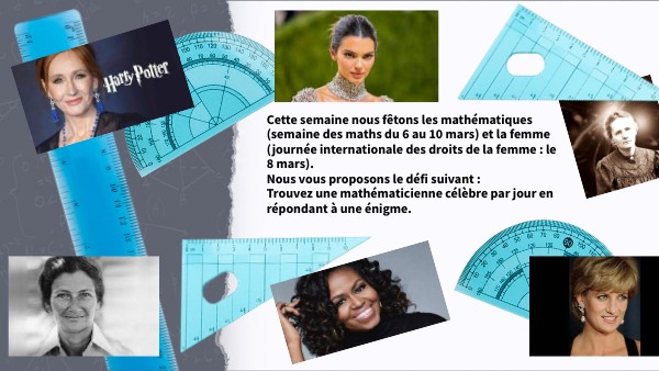 Cette semaine nous fêtons les mathématiques (semaine des maths du 6 au 10 mars) et la femme (journée internationale des droits de la femme : le 8 mars). Nous vous proposons le défi suivant : Trouvez une mathématicienne célèbre par jour en répondant à une énigme.