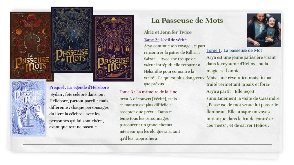 Tome 1 : La passeuse de Mot Arya est une jeune pâtissière vivant dans le royaume d'Helios , ou la magie est bannie . Mais , une révolution mais fin au traité permettant la paix et force Arya a partir . Elle reçoit simultanément la visite de Cassandre , Passeuse de mot venue lui passer le flambeau . Elle attaque un voyage initiatique dans le but de contrôler ces "mots" , et de sauver Helios .