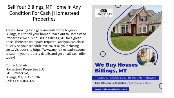 Are you looking for a genuine cash home buyer in Billings, MT, to sell your home? Reach out to Homestead Properties! We buy houses in Billings, MT, for a great price. There are no repairs required, and you can close quickly on your schedule. We cover all your closing costs. Visit our site https://www.myhomesteadmt.com/ to submit your property details and get an all-cash offer today!Contact details :Homestead Properties LLC941 Rimrock Rd, Billings, MT, USA - 59102Call: +1 406-861-4229