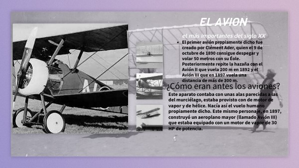 - El primer avión propiamente dicho fue creado por Clément Ader, quien el 9 de octubre de 1890 consigue despegar y volar 50 metros con su Éole. Posteriormente repite la hazaña con el Avión II que vuela 200 m en 1892 y el Avión III que en 1897 vuela una distancia de más de 300 m.