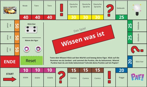 Teste dein Wissen! Klick auf den Würfel und beweg deine Figur. Klick auf die Nummer wo du landest und sammel die Punkte, die du bekommst. Wieviel Punkte hast du am Ende bekommen? Schreib deine Punkte auf ein Papier!