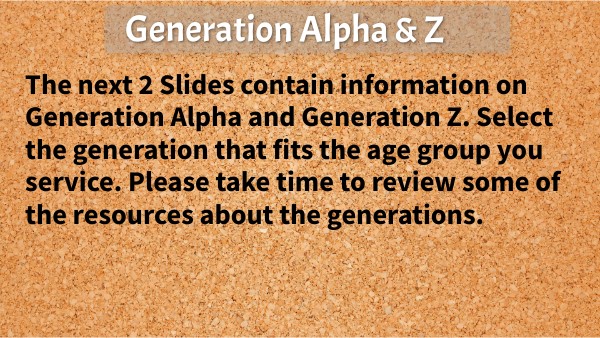 The next 2 Slides contain information on Generation Alpha and Generation Z. Select the generation that fits the age group you service. Please take time to review some of the resources about the generations.