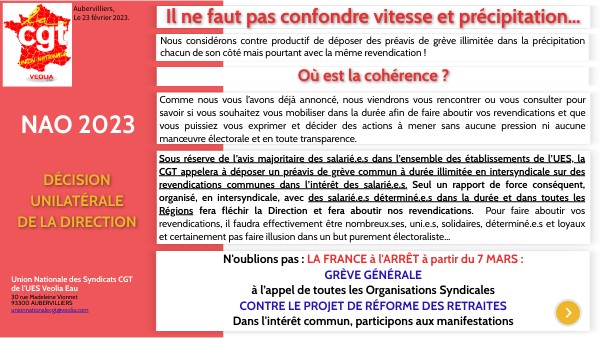 - faire une déclaration commune des 4 Organisations Syndicales lors du CSE Central du 8 mars en présence du Directeur Général de l’Eau France, Pierre RIBAUTE, afin de lui faire remonter en direct le mécontentement des salarié.e.s de l’UES au vu de la faiblesse des augmentations salariales mises en oeuvre unilatéralement ;