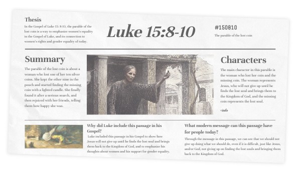 In the Gospel of Luke 15: 8-10, the parable of the lost coin is a way to emphasize women's equality in the Gospel of Luke, and its connection to women's rights and gender equality of today.