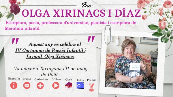 Aquest any es celebra el IV Certamen de Poesia Infantil i Juvenil Olga Xirinacs. Va nèixer a Tarragona l'11 de maig de 1936 .