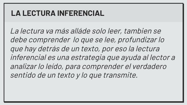 La lectura va más alláde solo leer, tambien se debe comprender lo que se lee, profundizar lo que hay detrás de un texto, por eso la lectura inferencial es una estrategia que ayuda al lector a analizar lo leído, para comprender el verdadero sentido de un texto y lo que transmite.