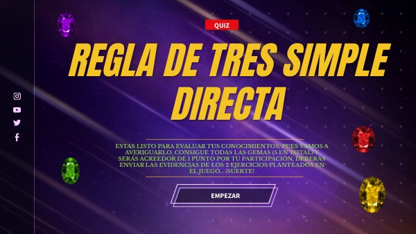 Estas listo para evaluar tus conocimientos, pues vamos a averiguarlo, consigue todas las gemas (5 en total) y serás acreedor de 1 punto por tu participación, deberás enviar las evidencias de los 2 ejercicios planteados en el juego… ¡Suerte!