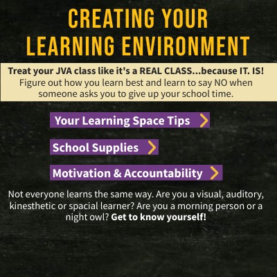 Treat your JVA class like it's a REAL CLASS...because IT. IS! Figure out how you learn best and learn to say NO when someone asks you to give up your school time.