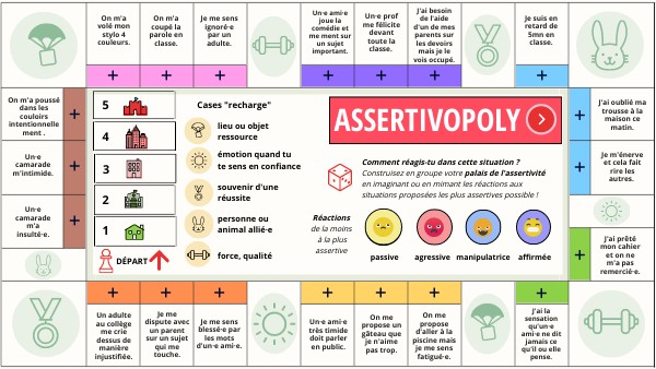 Matériel : plateau de jeu à imprimer ou projeter, un dé, 2 pions/ aimants , un chronomètre (1mn30) 20 cases "situations", 10 (2x5) cases "recharge", 5 paliers de maîtrise de l'assertivité Prévoir au besoin : listes des forces, des émotions, des besoins et un schéma de l'assertivité Âge : élèves de collège (cartes situations modifiables selon le public et ses besoins) Nombre de joueurs : 2 à 28 (avec des équipes de 2 minimum pour réfléchir aux situations) Comment jouer : Le groupe part d'où il souhaite, lance le dé et arrive sur une case "situation" ou "recharge" suivant le score du dé. SI ON TOMBE SUR UNE CASE "SITUATION" : Étape 1 : Analyse et proposition. Au sein de chaque équipe, réfléchir et partager collectivement sur les diverses réactions possibles face à la situation, afin de sélectionner la réaction la plus assertive en 1mn30. Étape 2 : Présentation au grand groupe de la réaction choisie Étape 3 : Analyse et classification de la réaction en grand groupe (passive, agressive, manipulatrice, assertive). Étape 4 : Validation et évolution. Si le grand groupe valide la réaction comme étant affirmée/assertive, le groupe entier monte d'un palier et relance le dé. SI ON TOMBE SUR UNE "RECHARGE" : C'est une recharge en confiance. Chacun partage les ressources dans lesquels on peut puiser avec son équipe, selon le thème de la case (objet/lieu ressource, émotion quand on se sent en confiance, moment de réussite, personne ou animal allié.e, force/qualité).