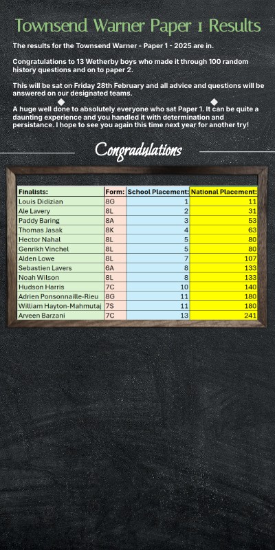 The results for the Townsend Warner - Paper 1 - 2025 are in. Congratulations to 13 Wetherby boys who made it through 100 random history questions and on to paper 2. This will be sat on Friday 28th February and all advice and questions will be answered on our designated teams. A huge well done to absolutely everyone who sat Paper 1. It can be quite a daunting experience and you handled it with determination and persistance. I hope to see you again this time next year for another try!