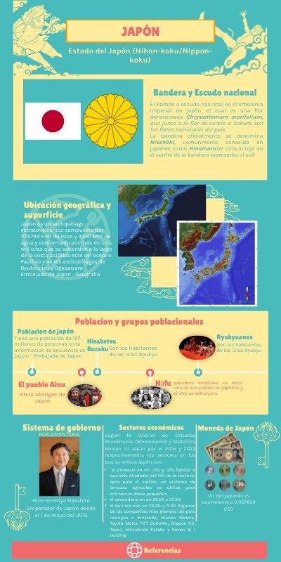 https://datosmacro.expansion.com/ipc-paises/japon https://santandertrade.com/es/portal/analizar-mercados/japon/cifras-comercio-exterior#classification_by_products https://www.exteriores.gob.es/Documents/FichasPais/JAPON_FICHA%20PAIS.pdf https://www.mofa.go.jp/policy/other/bluebook/2021/es_html/main02.html https://www.ieee.es/Galerias/fichero/docs_informativos/2012/DIEEEI53-2012_Las_disputas_territoriales_de_Japon_MHG.pdf https://www.cancilleria.gov.co/internacional/politica/regiones/asia-pacifico/japon https://www.colombia.emb-japan.go.jp/ESP/bilateral/comercial.htm#:~:text=Jap%C3%B3n%20es%20uno%20de%20los,participaci%C3%B3n%20de%20los%20claveles%20colombianos. https://japon.embajada.gov.co/colombia/asuntos_economicos
