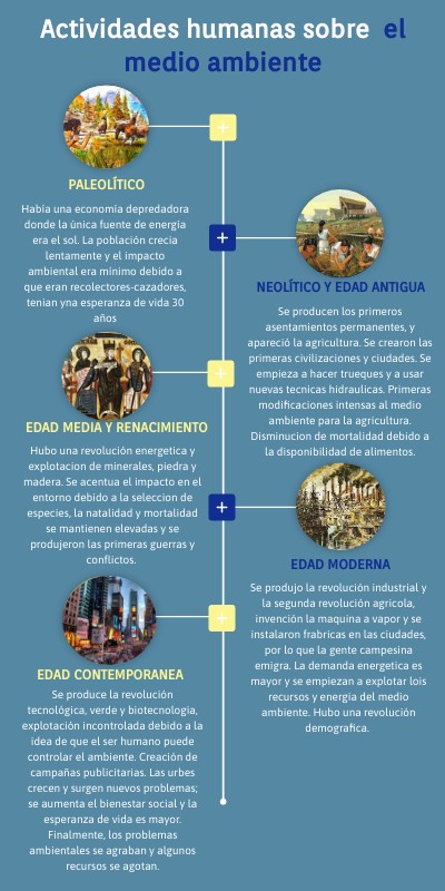 Se producen los primeros asentamientos permanentes, y apareció la agricultura. Se crearon las primeras civilizaciones y ciudades. Se empieza a hacer trueques y a usar nuevas tecnicas hidraulicas. Primeras modificaciones intensas al medio ambiente para la agricultura. Disminucion de mortalidad debido a la disponibilidad de alimentos.