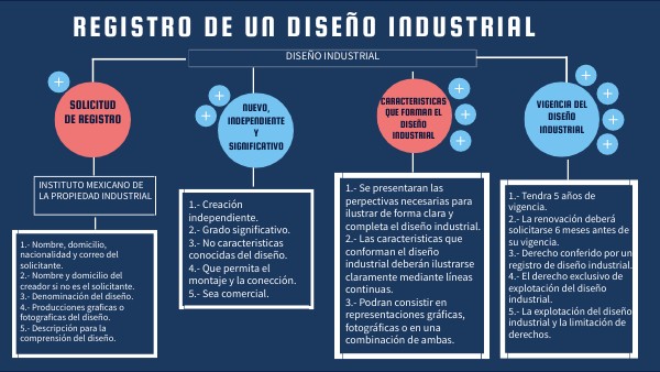 1.- Tendra 5 años de vigencia. 2.- La renovación deberá solicitarse 6 meses antes de su vigencia. 3.- Derecho conferido por un registro de diseño industrial. 4.- El derecho exclusivo de explotación del diseño industrial. 5.- La explotación del diseño industrial y la limitación de derechos.