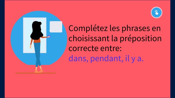 Complétez les phrases en choisissant la préposition correcte entre: dans, pendant, il y a.