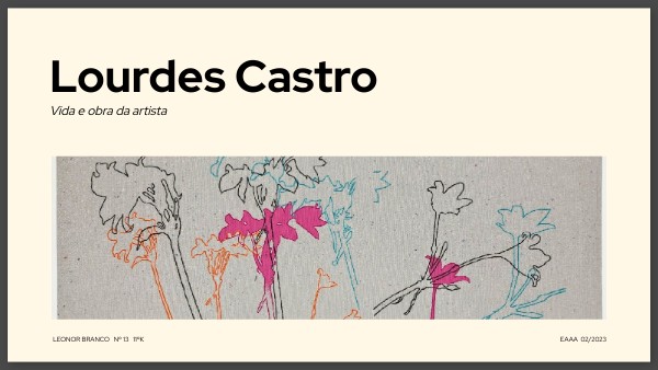 Páginas web:Autor desconhecido “Serralves – Lourdes Castro: A vida como ela é” (2022) disponível em: https://www.serralves.pt/ciclo-serralves/2205-a-vida-como-ela-e/; acedido a 03/02/23 Autor desconhecido“WikiArt” disponível em: https://www.wikiart.org/pt/lourdes-castro; acedido a 03/02/23 Autor desconhecido “Wikipédia” (2022) disponível em: https://pt.wikipedia.org/wiki/Lourdes_Castro; acedido a 03/02/2023 Autor desconhecido“Wikipédia” (2022) disponível em: https://pt.wikipedia.org/wiki/KWY; acedido a 03/02/2023 Autor desconhecido, “Morreu a artista plástica Lourdes Castro” (08/01/22) https://www.dn.pt/cultura/morreu-a-artista-plastica-lourdes-castro-14473054.html; acedido a 03/02/23 Autor desconhecido, “LOURDES CASTRO” disponível em: http://cvc.instituto-camoes.pt/biografias/lourdes-castro-dp1.html#.Y_ZEa3bP1Pa; acedido a 20/02/23 Autor desconhecido "Nascimento de Lourdes Castro” disponível em: https://www.e-cultura.pt/efemeride/332; acedido a 22/02/23 Autor desconhecido "Lourdes Castro: "A minha pintura é esta: o viver, o estar cá" (2010) disponível em: https://www.publico.pt/2010/03/03/culturaipsilon/noticia/lourdes-castro-quota-minha-pintura-e-esta-o-viver-o-estar-caquot-251893; acedido a 23/02/23 Autor desconhecido "Lourdes Castro (1930-2022) em 15 obras” (2022) disponível em: https://www.publico.pt/2022/01/08/culturaipsilon/fotogaleria/lourdes-castro-407368; acedido a 22/02/23 CRUA, Catarina, "Grande herbário de Sombras” (2013) disponível em: https://gulbenkian.pt/cam/works_cam/grande-herbario-de-sombras-sombra-de-datura-153812/; acedido a 21/02/23 CRUA, Catarina, "Lourdes Castro - Centro de Arte Moderna” (2013) disponível em: https://gulbenkian.pt/cam/artist/lourdes-castro/; acedido a 21/02/23 EMÍDIO MARQUES, Joana (2015). "Lourdes Castro: os livros de autor de uma artista rebelde" Disponível em: https://observador.pt/2015/07/14/lourdes-castro-os-livros-autor-artista-rebelde/ ; acedido em 22/02/23