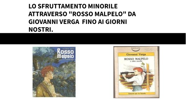 Rosso Malpelo famosa novella di Giovanni Verga pubblicata nel 1878 nella raccolta "Vita dei campi"considerata una delle massime espressioni del racconto verista racconta la vicenda di bambini sfruttati in miniera. Rosso Malpelo rappresenta il diverso a causa del suo colore di capelli,ma anche per via dei pregiudizi sorti intorno alla sua figura. L'autore rappresenta alla perfezione una fotografia delle condizioni dei lavoratori e dello sfruttamento minorile.