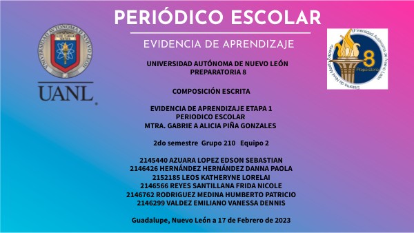 COMPOSICIÓN ESCRITA EVIDENCIA DE APRENDIZAJE ETAPA 1 PERIODICO ESCOLAR MTRA. GABRIE A ALICIA PIÑA GONZALES 2do semestre Grupo 210 Equipo 2 2145440 AZUARA LOPEZ EDSON SEBASTIAN 2146426 HERNÁNDEZ HERNÁNDEZ DANNA PAOLA 2152185 LEOS KATHERYNE LORELAI 2146566 REYES SANTILLANA FRIDA NICOLE 2146762 RODRIGUEZ MEDINA HUMBERTO PATRICIO 2146299 VALDEZ EMILIANO VANESSA DENNIS Guadalupe, Nuevo León a 17 de Febrero de 2023