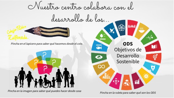 Nuestro centro contribuye a eliminar la pobreza y el hambre a través del Comedor escolar y la gestión de becas, el mercadillo solidario... Buscamos la salud y el bienestar de toda la comunidad educativa (ODS 3) mediante formación de docentes y familias, actividades dentro y fuera del aula, salidas y excursiones, maratón del colegio... Garantizamos una educación de calidad con un modelo inclusivo en el cual cabemos todos reduciendo las desigualdades. Somos centro preferente TEA y llevamos a cabo proyectos de innovación para la mejora de nuestros procesos de enseñanza-aprendizaje. Resaltamos la igualdad de género y empoderamos a todas las mujeres y las niñas, mediante diferentes actividades recogidas en el Plan de Igualdad de centro. Cuidamos y cultivamos nuestro huerto escolar favoreciendo el cuidado de nuestro medio ambiente. Llevamos a cabo acciones por el clima y respeto al medio terrestre y acuático así como también potenciamos el reciclaje y el consumo responsable mediante diferentes actividades a nivel de aula y de centro. Promovemos sociedades pacíficas centradas en la cooperación y el diálogo mediante actividades recogidas en el Plan de acción tutorial.