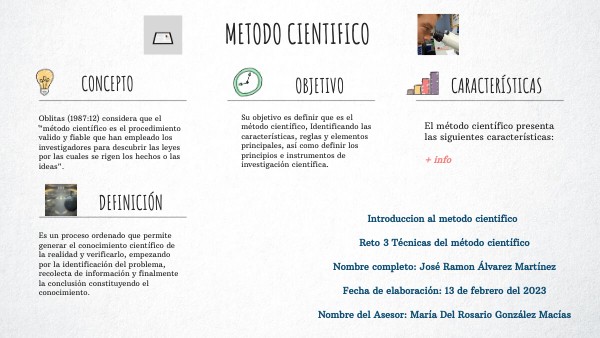 Introduccion al metodo cientifico Reto 3 Técnicas del método científico Nombre completo: José Ramon Álvarez MartínezFecha de elaboración: 13 de febrero del 2023 Nombre del Asesor: María Del Rosario González Macías