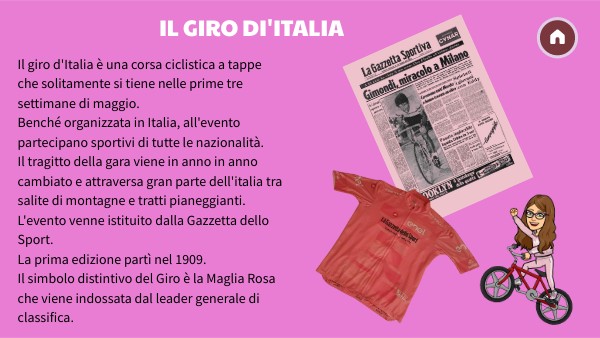 Il giro d'Italia è una corsa ciclistica a tappe che solitamente si tiene nelle prime tre settimane di maggio.Benché organizzata in Italia, all'evento partecipano sportivi di tutte le nazionalità.Il tragitto della gara viene in anno in anno cambiato e attraversa gran parte dell'italia tra salite di montagne e tratti pianeggianti. L'evento venne istituito dalla Gazzetta dello Sport. La prima edizione partì nel 1909. Il simbolo distintivo del Giro è la Maglia Rosa che viene indossata dal leader generale di classifica. I