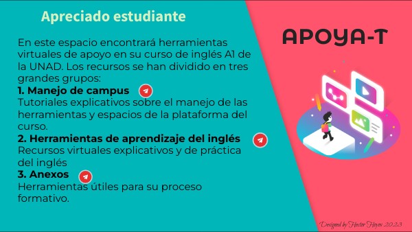 En este espacio encontrará herramientas virtuales de apoyo en su curso de inglés A1 de la UNAD. Los recursos se han dividido en tres grandes grupos:1. Manejo de campusTutoriales explicativos sobre el manejo de las herramientas y espacios de la plataforma del curso. 2. Herramientas de aprendizaje del inglés Recursos virtuales explicativos y de práctica del inglés3. AnexosHerramientas útiles para su proceso formativo.