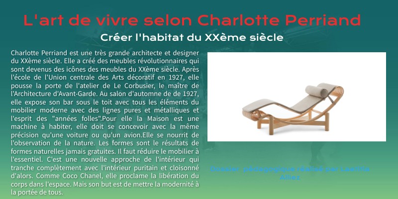 Charlotte Perriand est une très grande architecte et designer du XXème siècle. Elle a créé des meubles révolutionnaires qui sont devenus des icônes des meubles du XXème siècle. Après l'école de l'Union centrale des Arts décoratif en 1927, elle pousse la porte de l'atelier de Le Corbusier, le maître de l'Architecture d'Avant-Garde. Au salon d'automne de de 1927, elle expose son bar sous le toit avec tous les éléments du mobilier moderne avec des lignes pures et métalliques et l'esprit des "années folles".Pour elle la Maison est une machine à habiter, elle doit se concevoir avec la même précision qu'une voiture ou qu'un avion.Elle se nourrit de l'observation de la nature. Les formes sont le résultats de formes naturelles jamais gratuites. Il faut réduire le mobilier à l'essentiel. C'est une nouvelle approche de l'intérieur qui tranche complètement avec l'intérieur puritain et cloisonné d'alors. Comme Coco Chanel, elle proclame la libération du corps dans l'espace. Mais son but est de mettre la modernité à la portée de tous.