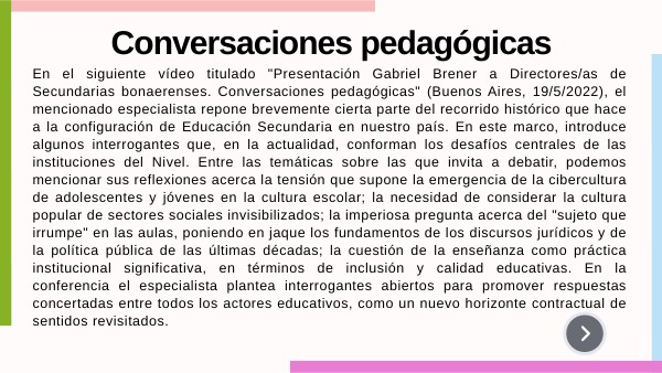 En el siguiente vídeo titulado "Presentación Gabriel Brener a Directores/as de Secundarias bonaerenses. Conversaciones pedagógicas" (Buenos Aires, 19/5/2022), el mencionado especialista repone brevemente cierta parte del recorrido histórico que hace a la configuración de Educación Secundaria en nuestro país. En este marco, introduce algunos interrogantes que, en la actualidad, conforman los desafíos centrales de las instituciones del Nivel. Entre las temáticas sobre las que invita a debatir, podemos mencionar sus reflexiones acerca la tensión que supone la emergencia de la cibercultura de adolescentes y jóvenes en la cultura escolar; la necesidad de considerar la cultura popular de sectores sociales invisibilizados; la imperiosa pregunta acerca del "sujeto que irrumpe" en las aulas, poniendo en jaque los fundamentos de los discursos jurídicos y de la política pública de las últimas décadas; la cuestión de la enseñanza como práctica institucional significativa, en términos de inclusión y calidad educativas. En la conferencia el especialista plantea interrogantes abiertos para promover respuestas concertadas entre todos los actores educativos, como un nuevo horizonte contractual de sentidos revisitados.