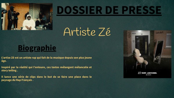 L'artise Zé est un artiste rap qui fait de la musique depuis son plus jeune âge. Inspiré par la réalité qui l'entoure, ces textes mélangent mélancolie et story telling . Il lance une série de clips dans le but de se faire une place dans le paysage du Rap Français .