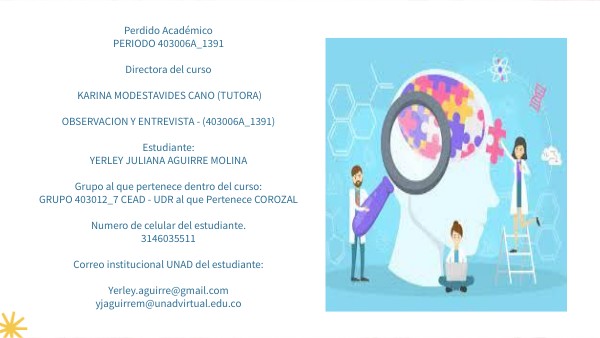 Perdido Académico PERIODO 403006A_1391 Directora del curso KARINA MODESTAVIDES CANO (TUTORA) OBSERVACION Y ENTREVISTA - (403006A_1391) Estudiante: YERLEY JULIANA AGUIRRE MOLINA Grupo al que pertenece dentro del curso: GRUPO 403012_7 CEAD - UDR al que Pertenece COROZAL Numero de celular del estudiante. 3146035511 Correo institucional UNAD del estudiante: Yerley.aguirre@gmail.com yjaguirrem@unadvirtual.edu.co