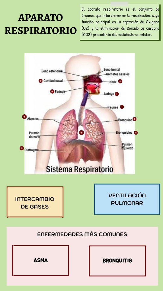 El aparato respiratorio es el conjunto de órganos que intervienen en la respiración, cuya función principal es la captación de Oxígeno (O2) y la eliminación de Dióxido de carbono (CO2) procedente del metabolismo celular.