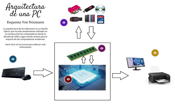 La arquitectura de Von Neumann es un diseño clásico que ha sido ampliamente utilizado en la construcción de computadoras desde la década de 1940 y sigue siendo la base para la mayoría de las computadoras modernas. Hacé click en los íconos para obtener más información