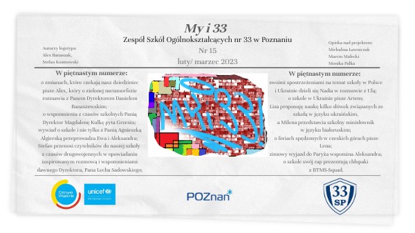I: Między lekcjami - o szkole 1. Zielona metamorfoza, czyli idą zmiany! Alex Banaszak ......................................................................................................................................................................4 2. Wywiad z Panią Dyrektor Magdaleną Kulką Grzegorz Głowicki, Magdalena Kulka ..................................................................................................................................9 3. Interview with the teacher Agnieszka Algierska, Ewa Długaszewska, Aleksandra Tomaszewska ................................................................................12 4. Powrót do szkoły... Stefan Kosmowski ..............................................................................................................................................................15 5. Trochę inna szkoła Nadiia Miroshychenko, Urszula Polewczyńska ..................................................................................................................18 6. Szkoła w Ukrainie, a szkoła w Polsce Artem Kudria .....................................................................................................................................................................20 7. Szkolny minisłownik: j. polski - j. ukraiński Yelisaveta Tkachenko .........................................................................................................................................................22 8. Szkolny minisłownik: j. polski - j. białoruski Milena Vasileuskaya ...........................................................................................................................................................23