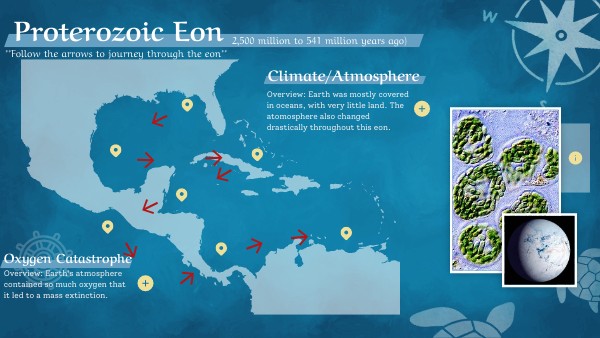 Overview: Earth was mostly covered in oceans, with very little land. The atomosphere also changed drastically throughout this eon.