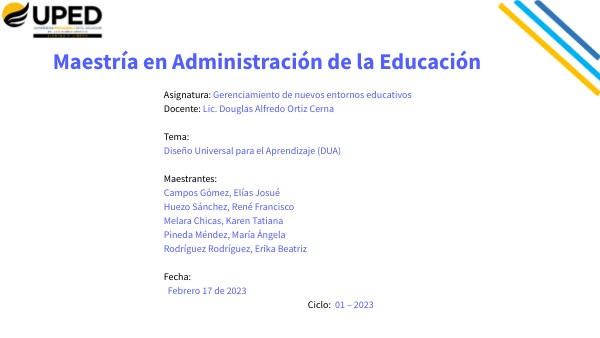 Asignatura: Gerenciamiento de nuevos entornos educativos Docente: Lic. Douglas Alfredo Ortiz Cerna Tema: Diseño Universal para el Aprendizaje (DUA) Maestrantes: Campos Gómez, Elías Josué Huezo Sánchez, René Francisco Melara Chicas, Karen Tatiana Pineda Méndez, María Ángela Rodríguez Rodríguez, Erika Beatriz Fecha: Febrero 17 de 2023 Ciclo: 01 – 2023