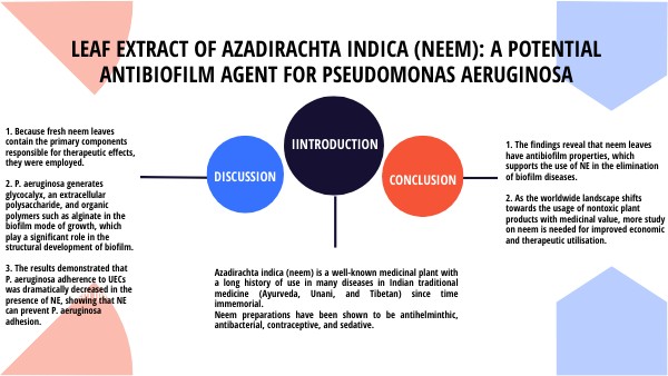 1. The findings reveal that neem leaves have antibiofilm properties, which supports the use of NE in the elimination of biofilm diseases. 2. As the worldwide landscape shifts towards the usage of nontoxic plant products with medicinal value, more study on neem is needed for improved economic and therapeutic utilisation.