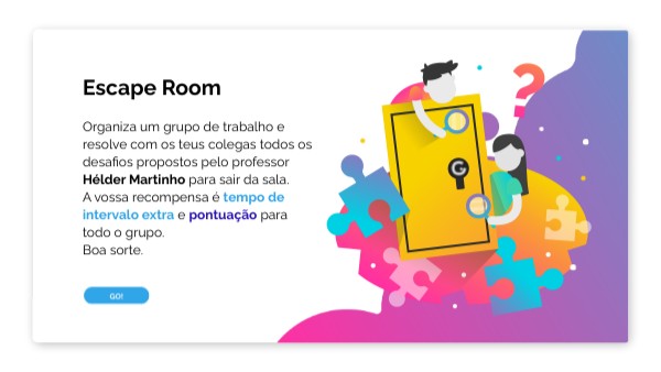 Organiza um grupo de trabalho e resolve com os teus colegas todos os desafios propostos pelo professor Hélder Martinho para sair da sala. A vossa recompensa é tempo de intervalo extra e pontuação para todo o grupo. Boa sorte.