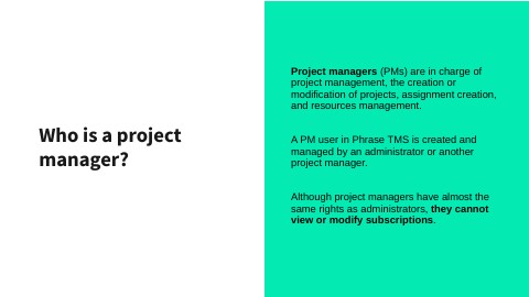 Project managers (PMs) are in charge of project management, the creation or modification of projects, assignment creation, and resources management. A PM user in Phrase TMS is created and managed by an administrator or another project manager. Although project managers have almost the same rights as administrators, they cannot view or modify subscriptions.