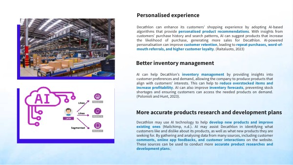 Decathlon can enhance its customers' shopping experience by adopting AI-based algorithms that provide personalised product recommendations. With insights from customers' purchase history and search patterns, AI can suggest products that increase the likelihood of purchase, generating more sales for Decathlon. AI-powered personalisation can improve customer retention, leading to repeat purchases, word-of-mouth referrals, and higher customer loyalty. (Raitaluoto, 2023)