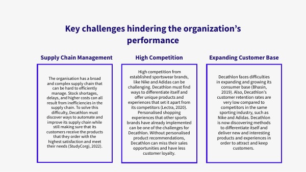 The organisation has a broad and complex supply chain that can be hard to efficiently manage. Stock shortages, delays, and higher costs can all result from inefficiencies in the supply chain. To solve this difficulty, Decathlon must discover ways to automate and improve its supply chain while still making sure that its customers receive the products that they order with the highest satisfaction and meet their needs (StudyCorgi, 2022).