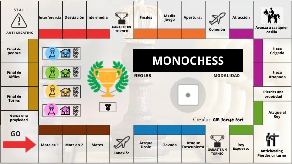GO: Cada que demos la vuelta y pasemos por esta casilla se obtiene una medalla por el recorrido.AVION: Viaja automáticamente a la otra casilla de avión. TROFEO: Se obtiene una medalla automáticamente sin realizar ningún problema de ajedrez. ANTI-CHEATING: Si solo está de paso no se realiza ninguna acción, si en cambio se llegó aquí debido a la casilla "Ve al Anti-Cheating" entonces se pierde un turno. AVANZA A CUALQUIER CASILLA: El equipo puede decidir avanzar a cualquier casilla incluido las especiales. (No se obtiene medalla en caso pase por GO)- EMPEZAR:
