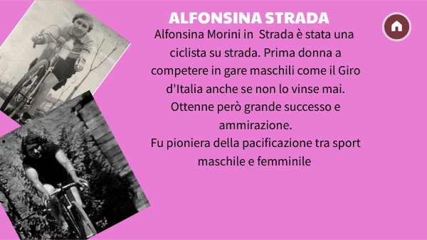Alfonsina Morini in Strada è stata una ciclista su strada. Prima donna a competere in gare maschili come il Giro d'Italia anche se non lo vinse mai. Ottenne però grande successo e ammirazione. Fu pioniera della pacificazione tra sport maschile e femminile
