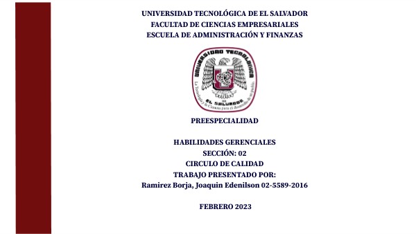 UNIVERSIDAD TECNOLÓGICA DE EL SALVADOR FACULTAD DE CIENCIAS EMPRESARIALES ESCUELA DE ADMINISTRACIÓN Y FINANZAS PREESPECIALIDAD HABILIDADES GERENCIALES SECCIÓN: 02 CIRCULO DE CALIDAD TRABAJO PRESENTADO POR: Ramirez Borja, Joaquin Edenilson 02-5589-2016 FEBRERO 2023