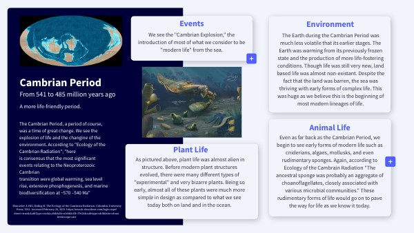 The Earth during the Cambrian Period was much less volatile that its earlier stages. The Earth was warming from its previously frozen state and the production of more life-fostering conditions. Though life was still very new, land based life was almost non-existant. Despite the fact that the land was barren, the sea was thriving with early forms of complex life. This was huge as we believe this is the beginning of most modern lineages of life.
