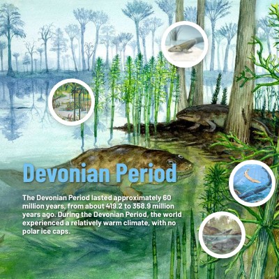 The Devonian Period lasted approximately 60 million years, from about 419.2 to 358.9 million years ago. During the Devonian Period, the world experienced a relatively warm climate, with no polar ice caps.