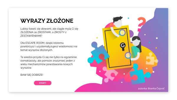Lubisz bawić się słowami, ale ciągle mylą Ci się ZŁOŻENIA ze ZROSTAMI, a ZROSTY z ZESTAWIENIAMI? Oto ESCAPE ROOM, dzięki któremu powtórzysz i usystematyzujesz wiadomości na temat wyrazów złożonych. Ta wiedza przyda Ci się nie tylko na egzaminie ósmoklasisty, ale pomoże zrozumieć jeden z wielu mechanizmów powstawania nowych wyrazów.BAW SIĘ DOBRZE!